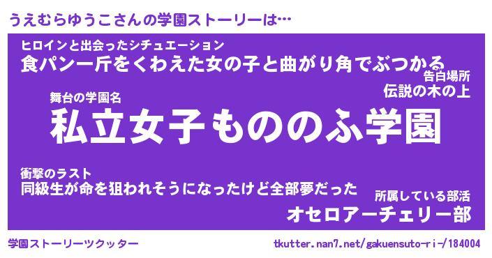 | 女子向けラノベタイトル風あだ名 | 『誰かこのうえむらゆうこを説明してください! ~契約から始まるウェディング~』 |