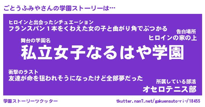 | 女子向けラノベタイトル風あだ名 | 『誰かこのごとうふみやを説明してください! ~契約から始まるウェディング~』 |