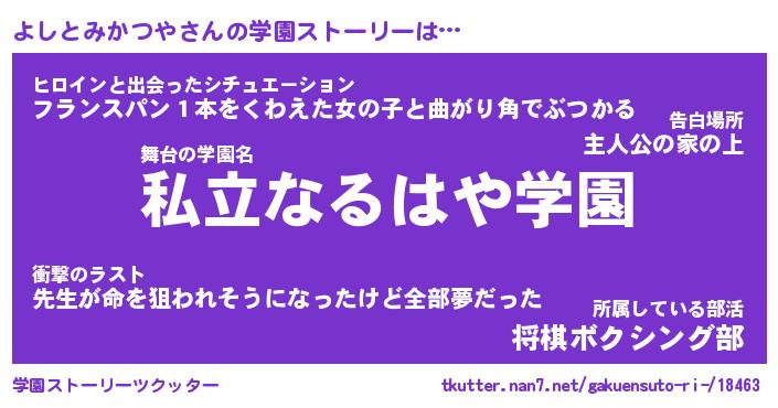 | 女子向けラノベタイトル風あだ名 | 『(仮)よしとみかつやのやんごとなき事情』 |