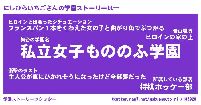 | 男性向けラノベタイトル風あだ名 | 『ニシヒライチゴアートオンライン』 |
