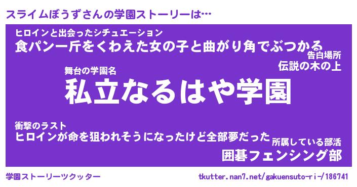 | 男性向けラノベタイトル風あだ名 | 『スライムぼうずの憂鬱』 |