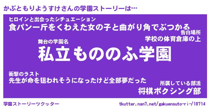 | 男性向けラノベタイトル風あだ名 | 『かぶともりようすけの憂鬱』 |