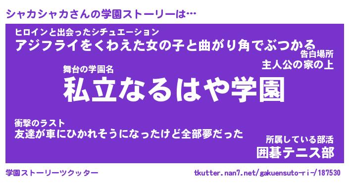 | 告白場所 先生の家の上 …「ふぃぎゅこ」 | 2月17日 06:24 |