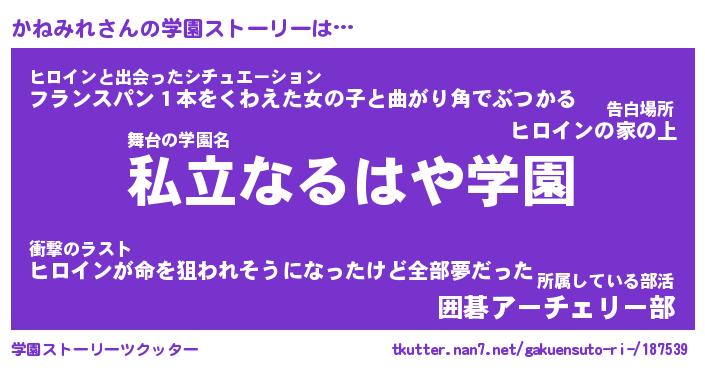 | 男性向けラノベタイトル風あだ名 | 『かねみれの憂鬱』 |