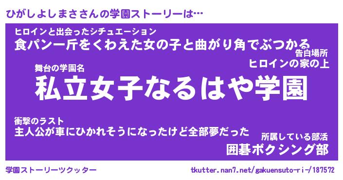 | 女子向けラノベタイトル風あだ名 | 『誰かこのひがしよしまさを説明してください! ~契約から始まるウェディング~』 |