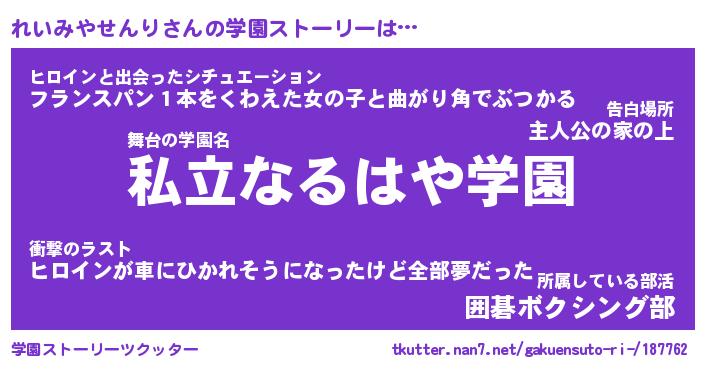 | 伝説のあだ名 | 『伝説のスナイパーれいみやせんり』 |