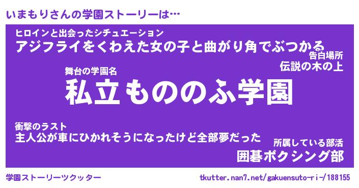 | 男性向けラノベタイトル風あだ名 | 『いまもりの憂鬱』 |