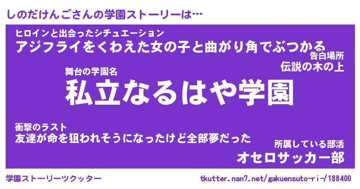 | 女子向けラノベタイトル風あだ名 | 『(仮)しのだけんごのやんごとなき事情』 |