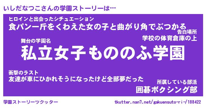 | ヒーロー風カッコイイあだ名 | 『スーパーイシダナツコ』『暗黒騎士イシ』 |