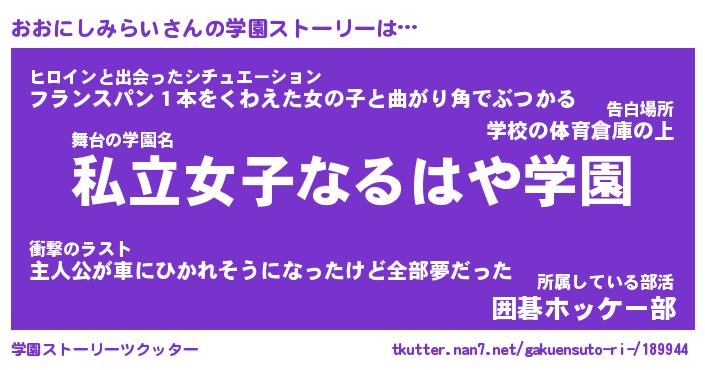 | 女子向けラノベタイトル風あだ名 | 『おおにしみらい姫と円卓の騎士』 |
