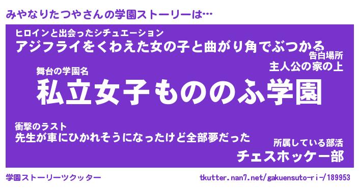 | 女子向けラノベタイトル風あだ名 | 『誰かこのみやなりたつやを説明してください! ~契約から始まるウェディング~』 |