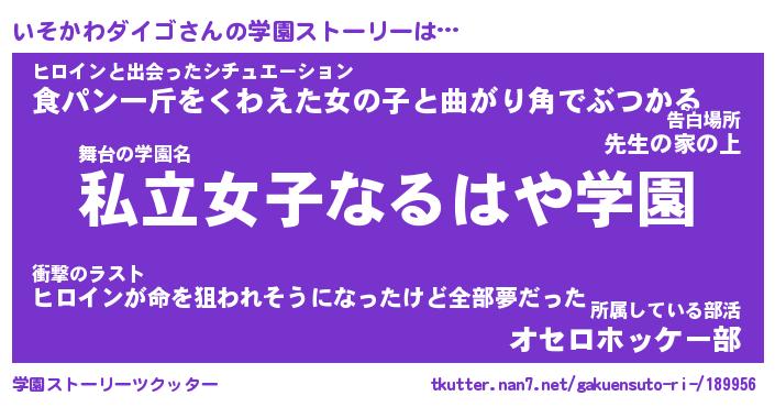 | 伝説のあだ名 | 『封印されしスナイパーいそかわダイゴ』 |