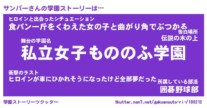 | 先生 | サンパー先生が勤める学校名『道立もふもふ高校』 |