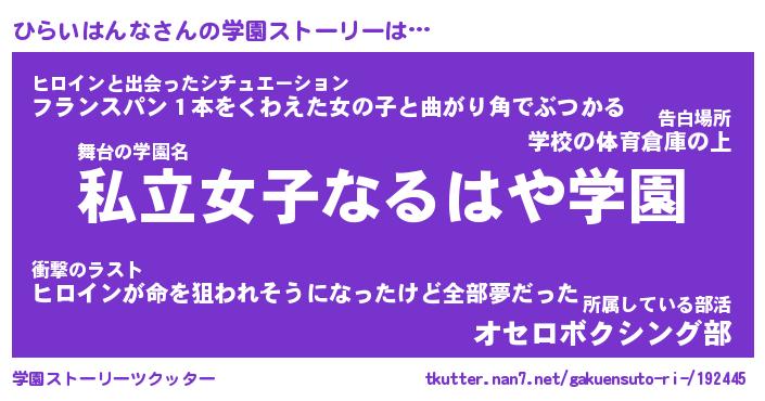 | 男性向けラノベタイトル風あだ名 | 『ヒライハンナアートオンライン』 |