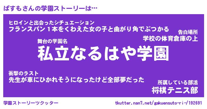 | 女子向けラノベタイトル風あだ名 | 『(仮)ぱすものやんごとなき事情』 |