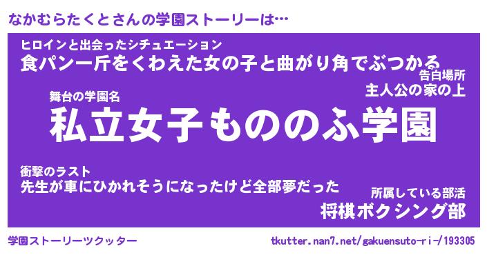 | 女子向けラノベタイトル風あだ名 | 『なかむらたくと姫と円卓の騎士』 |