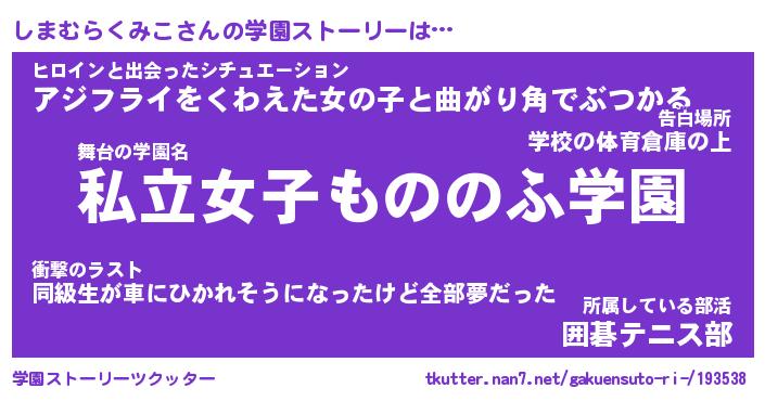 | 女子向けラノベタイトル風あだ名 | 『しまむらくみこ姫と円卓の騎士』 |