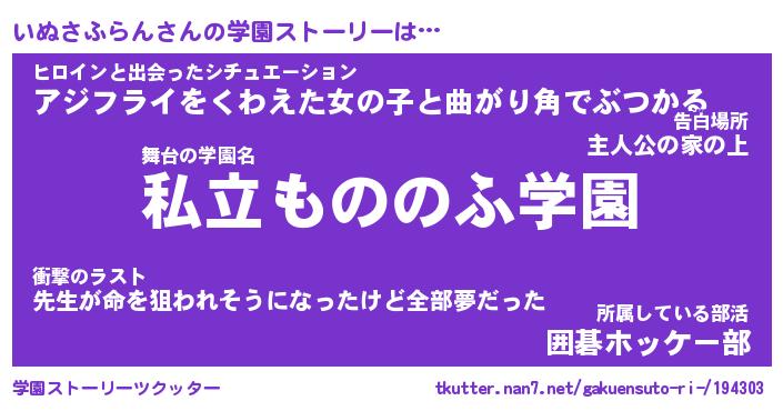 | 男性向けラノベタイトル風あだ名 | 『いぬさふらんの憂鬱』 |