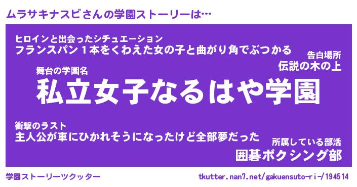 | 男性向けラノベタイトル風あだ名 | 『ムラサキナスビアートオンライン』 |