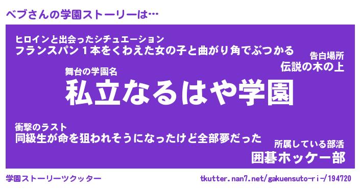 | 女子向けラノベタイトル風あだ名 | 『(仮)ベブのやんごとなき事情』 |