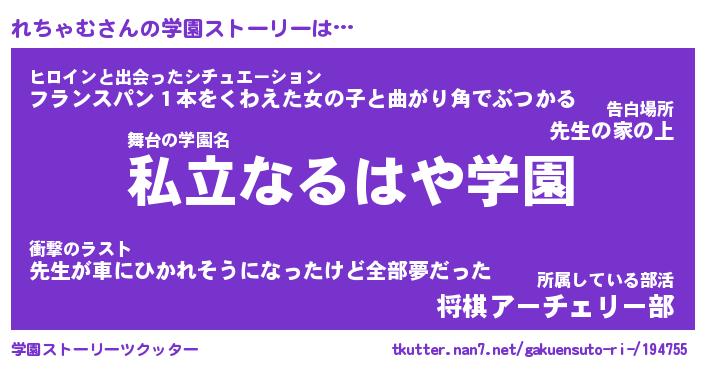 | 女子向けラノベタイトル風あだ名 | 『(仮)れちゃむのやんごとなき事情』 |