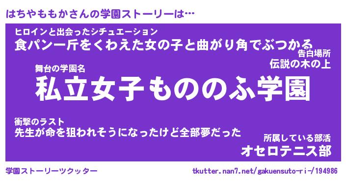 | 女子向けラノベタイトル風あだ名 | 『はちやももか姫と円卓の騎士』 |