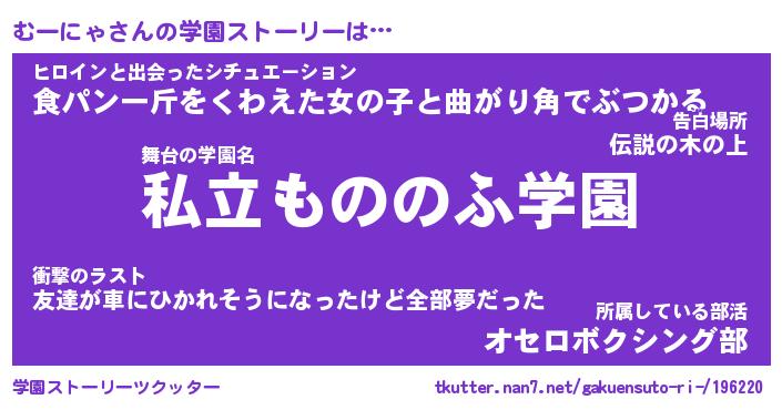 | 女子向けラノベタイトル風あだ名 | 『(仮)むーにゃのやんごとなき事情』 |