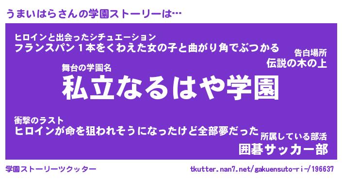 | 女子向けラノベタイトル風あだ名 | 『(仮)うまいはらのやんごとなき事情』 |