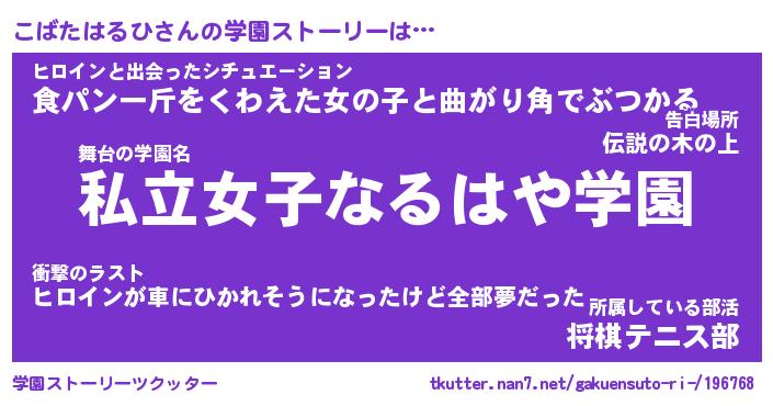 | 女子向けラノベタイトル風あだ名 | 『こばたはるひ姫と円卓の騎士』 |
