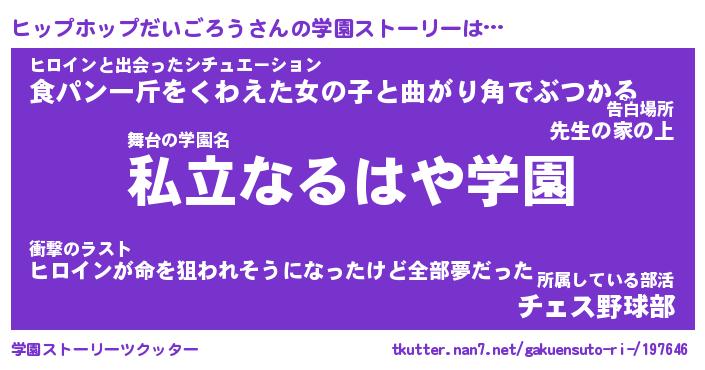 | 女子向けラノベタイトル風あだ名 | 『(仮)ヒップホップだいごろうのやんごとなき事情』 |