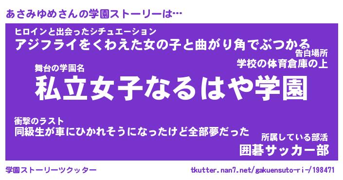 | ファンタジー風あだ名 | 『アサフェル』『エターナルアサミユメー』 |