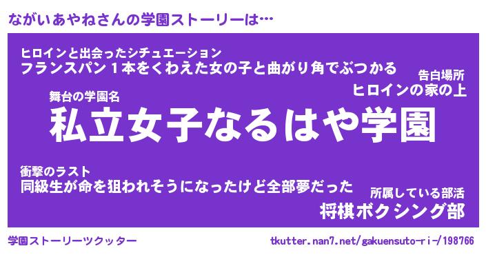 | 女子向けラノベタイトル風あだ名 | 『誰かこのながいあやねを説明してください! ~契約から始まるウェディング~』 |