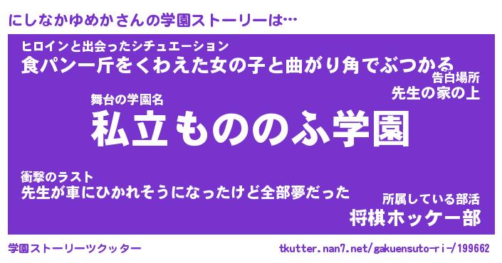 | 女子向けラノベタイトル風あだ名 | 『(仮)にしなかゆめかのやんごとなき事情』 |