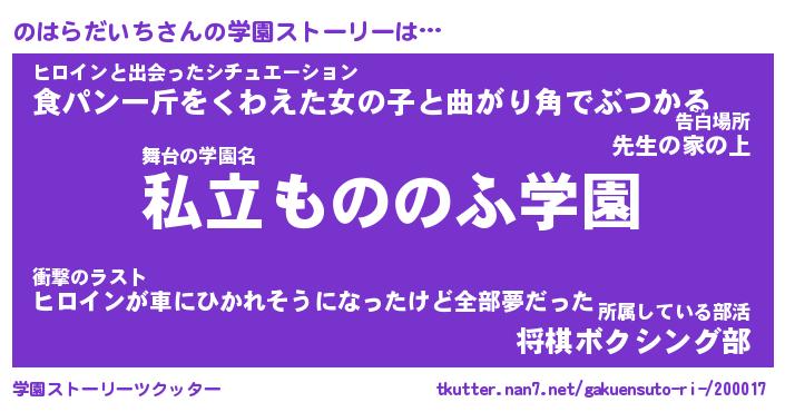 | 男性向けラノベタイトル風あだ名 | 『のはらだいちの憂鬱』 |
