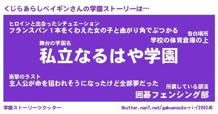 | 女子向けラノベタイトル風あだ名 | 『(仮)くじらあらしペイギンのやんごとなき事情』 |