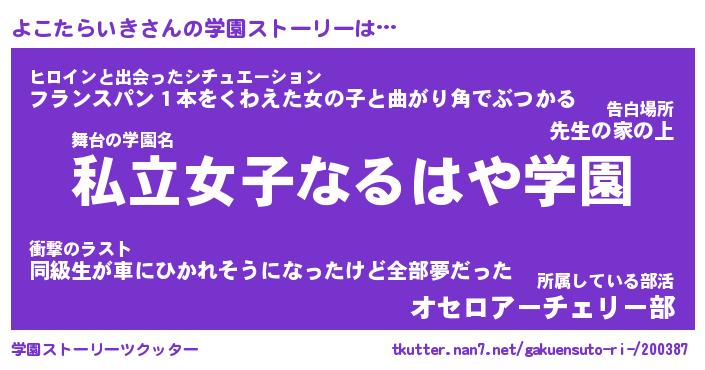 | 女子向けラノベタイトル風あだ名 | 『よこたらいき姫と円卓の騎士』 |