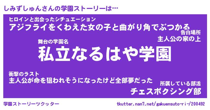 | 男性向けラノベタイトル風あだ名 | 『しみずしゅんの憂鬱』 |