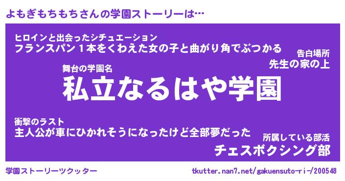 | 女子向けラノベタイトル風あだ名 | 『(仮)よもぎもちもちのやんごとなき事情』 |