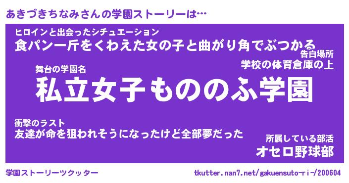 | 男性向けラノベタイトル風あだ名 | 『アキヅキチナミアートオンライン』 |