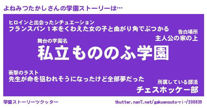 | 男性向けラノベタイトル風あだ名 | 『よねみつたかしの憂鬱』 |