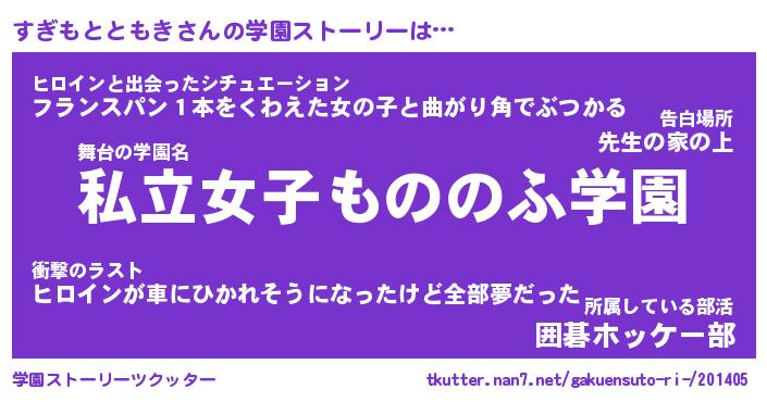 | 女子向けラノベタイトル風あだ名 | 『誰かこのすぎもとともきを説明してください! ~契約から始まるウェディング~』 |