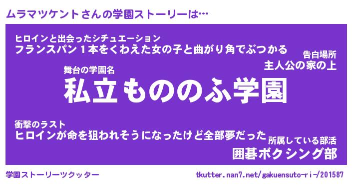 | 男性向けラノベタイトル風あだ名 | 『ムラマツケントの憂鬱』 |
