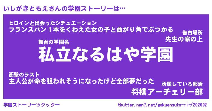 | 男性向けラノベタイトル風あだ名 | 『いしがきともえの憂鬱』 |
