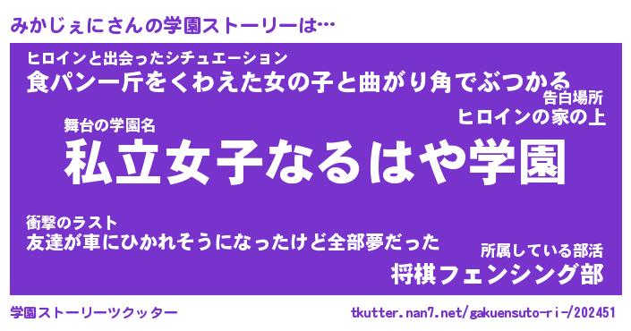 | 男性向けラノベタイトル風あだ名 | 『ミカジェニアートオンライン』 |