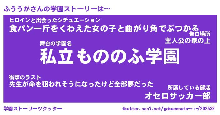 | 男性向けラノベタイトル風あだ名 | 『ふううかの憂鬱』 |