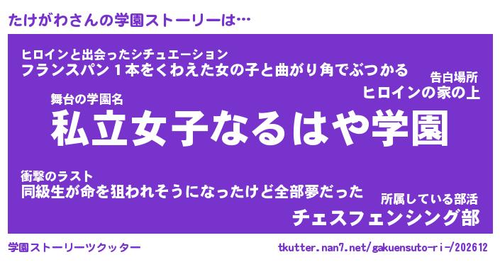 | 女子向けラノベタイトル風あだ名 | 『たけがわ姫と円卓の騎士』 |