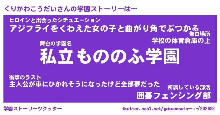 | 男性向けラノベタイトル風あだ名 | 『くりかわこうだいの憂鬱』 |