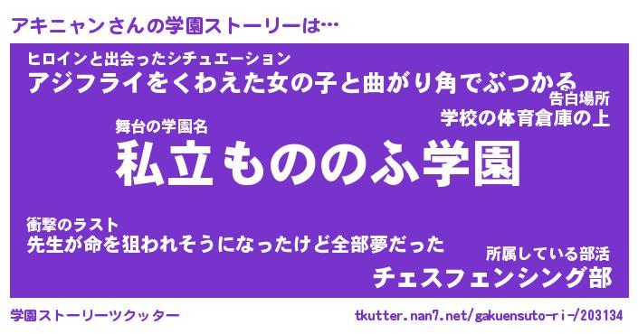 | 男性向けラノベタイトル風あだ名 | 『アキニャンの憂鬱』 |