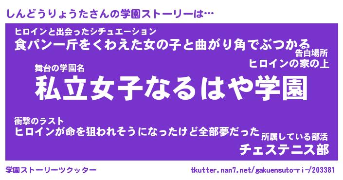 | 女子向けラノベタイトル風あだ名 | 『しんどうりょうた姫と円卓の騎士』 |