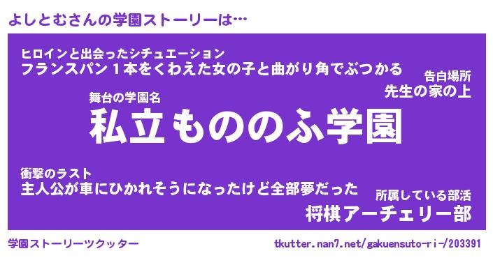 | 男性向けラノベタイトル風あだ名 | 『よしとむの憂鬱』 |